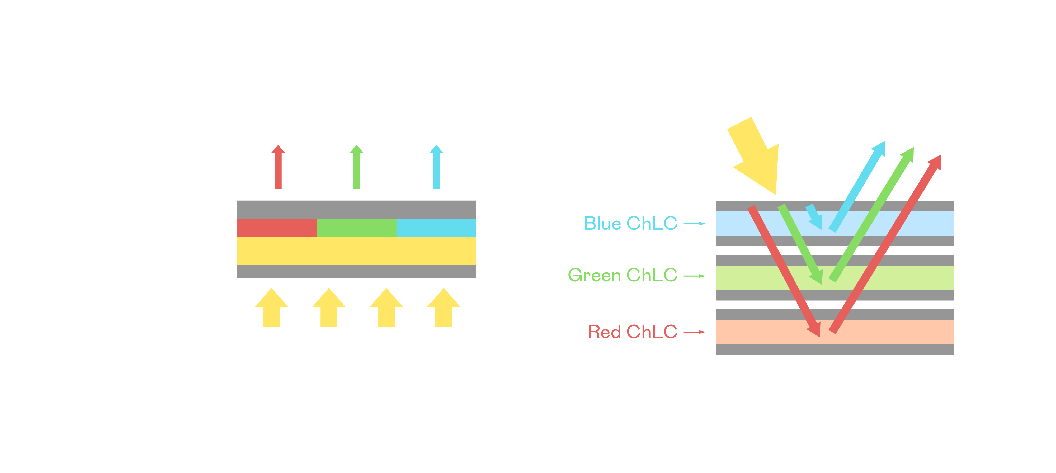 赢多多胆固醇液晶显示器是由红、绿、蓝三层胆固醇液晶面板堆叠而成,并采用无彩色滤光片设计,减少环境光在反射过程中的损耗。